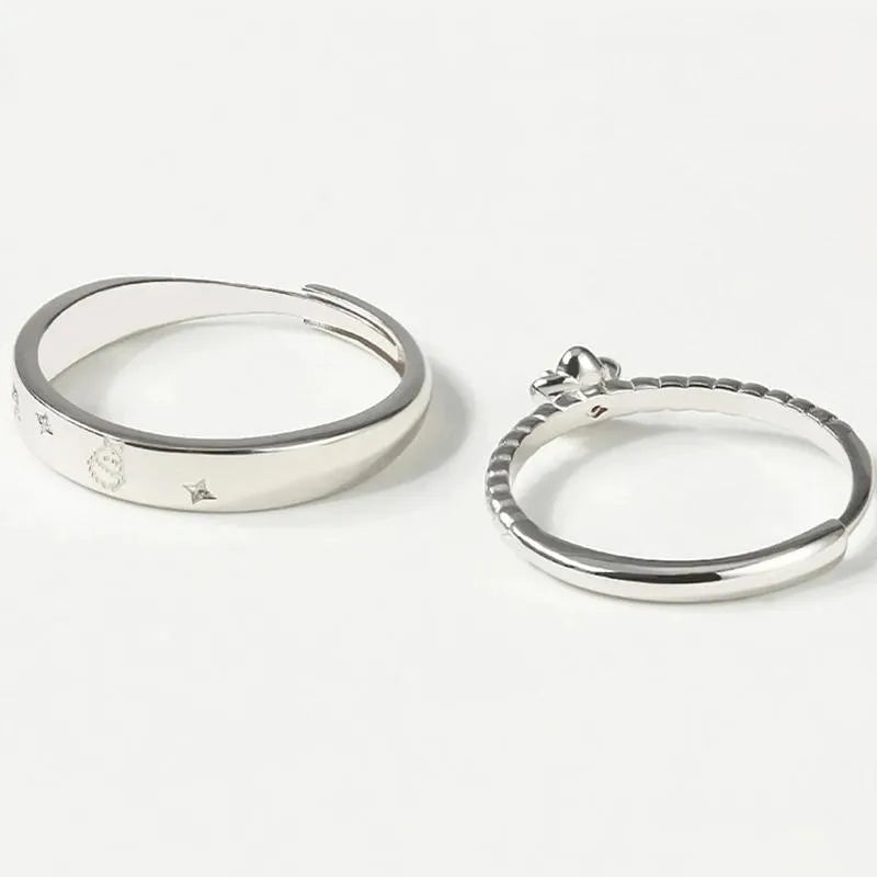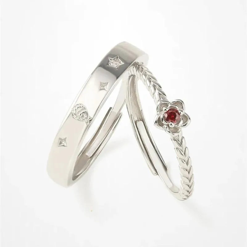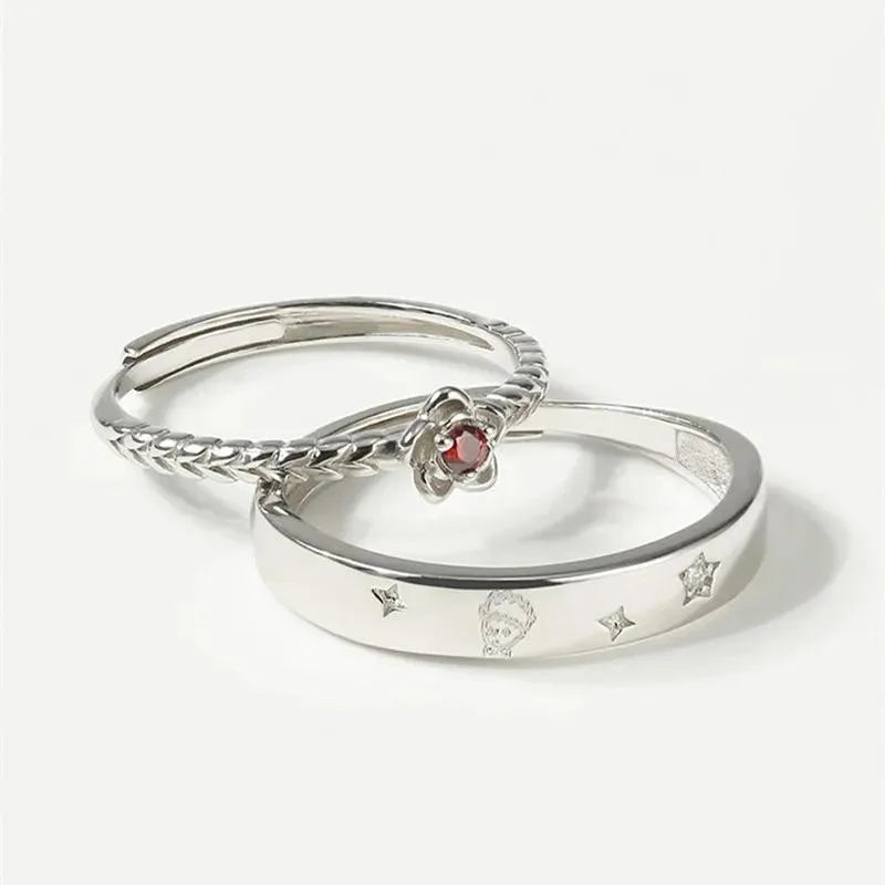 Um presente que fala de amor, saudade e eternidade. Este conjunto de anéis foi inspirado na poética relação entre o Pequeno Príncipe e sua Rosa, símbolo eterno de cuidado e sentimento verdadeiro. Um dos anéis traz delicadamente a rosa com uma pedra vermelha ao centro, enquanto o outro exibe estrelas e o rosto do príncipe, representando a saudade que só quem ama de verdade entende.