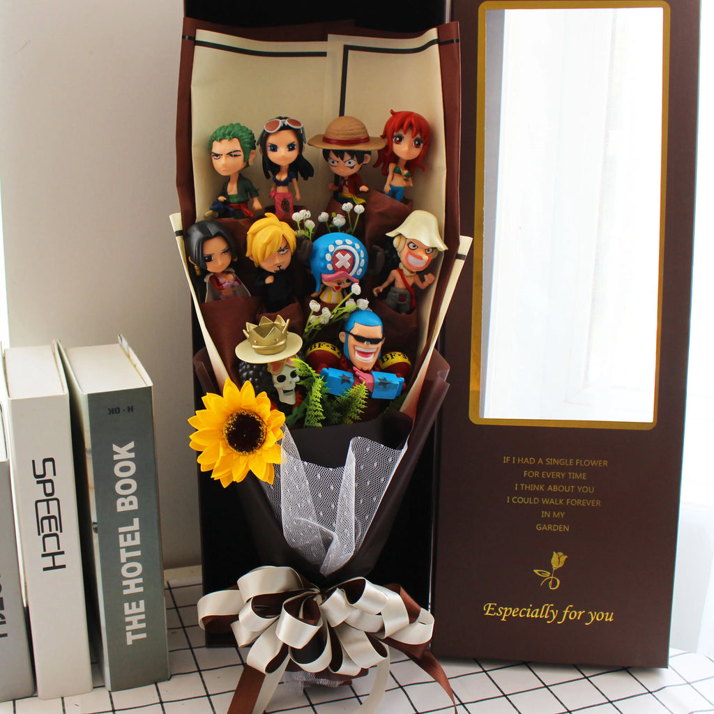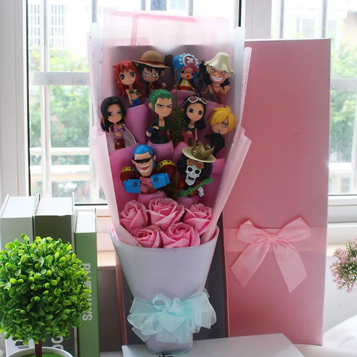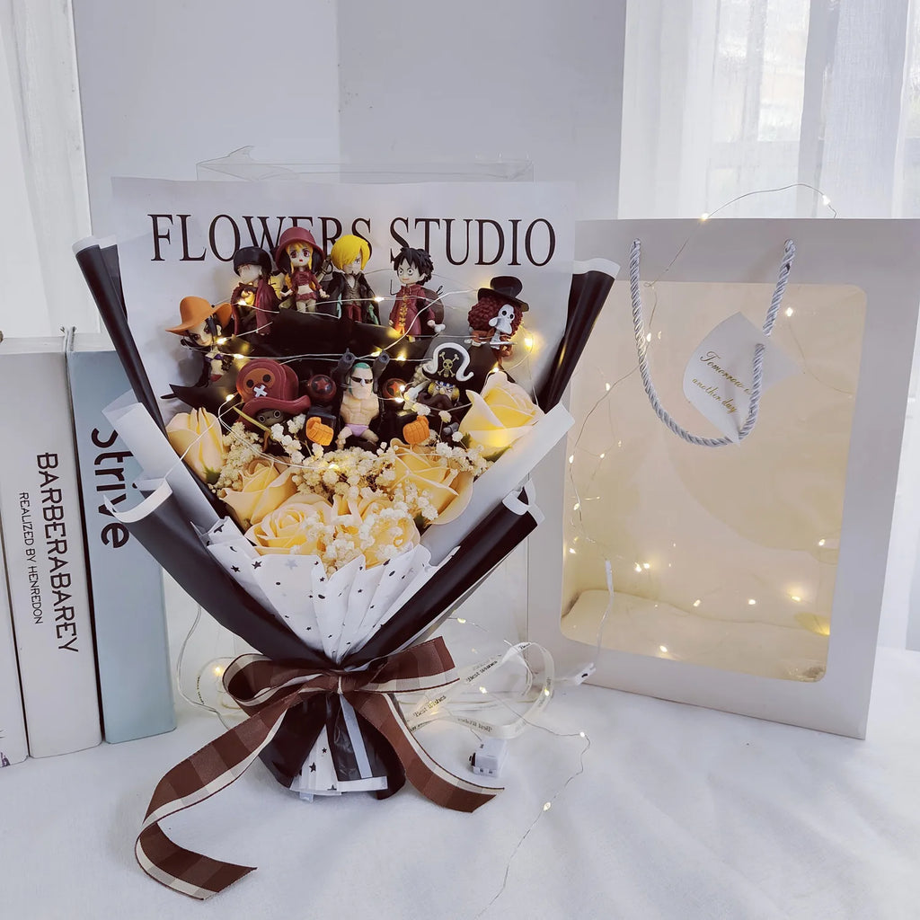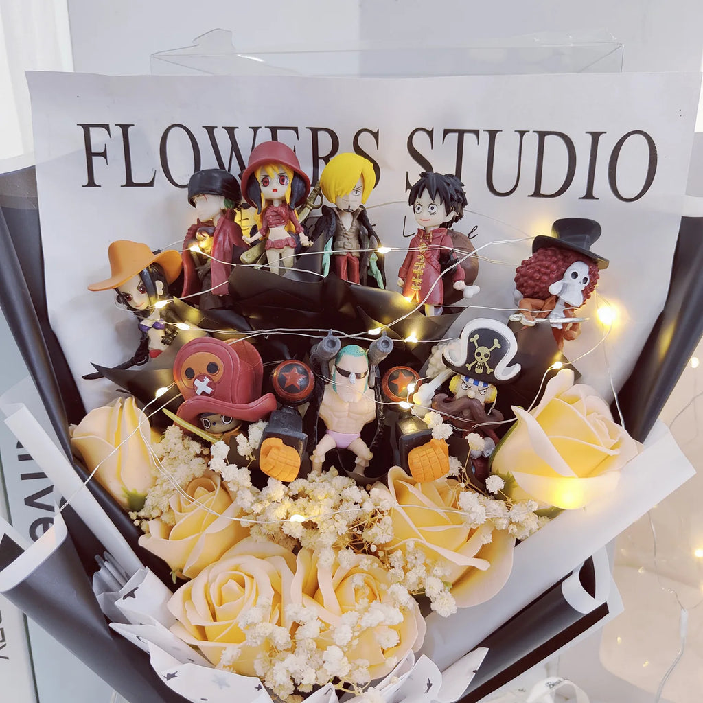 Surpreenda quem você ama com um presente fora do comum! Esse buquê mistura rosas artificiais com mini figures dos personagens mais amados de One Piece — Luffy, Zoro, Nami, Sanji, Chopper, Robin, Usopp, Franky, Brook e Jinbei — em um arranjo super criativo, cheio de cor e energia. Acompanha caixa de presente e luzes LED para deixar tudo ainda mais mágico. Ideal para datas especiais como aniversários, formaturas, ou apenas pra fazer alguém sorrir como um verdadeiro nakama!