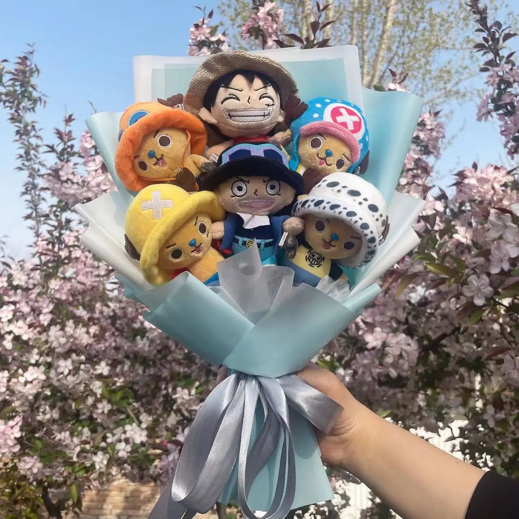 Surpreenda quem você ama com esse buquê fora do comum! Inspirado no universo de One Piece, ele reúne os personagens mais adorados da tripulação dos Chapéus de Palha, como Luffy, Chopper, Ace e Law, em mini pelúcias fofíssimas, todas embaladas em um buquê artesanal com laço de cetim.