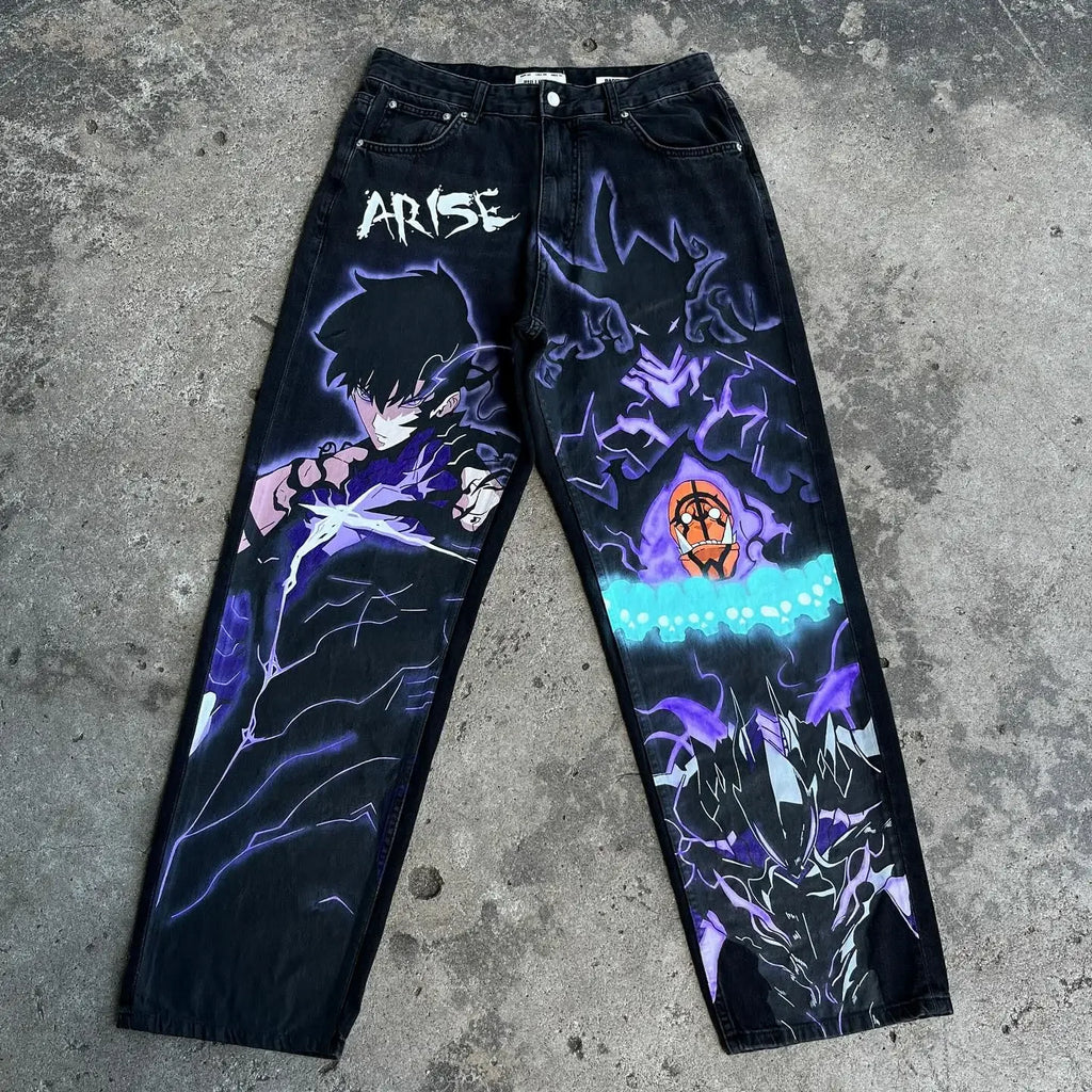 Essa calça jeans wide leg é uma homenagem direta a Sung Jin-Woo, protagonista de Solo Leveling, em sua forma mais sombria e poderosa. Com arte gráfica vibrante, visual de raios e sombras púrpuras, e a palavra “ARISE” estampada na perna, essa peça é puro impacto visual — feita pra quem veste seu anime favorito com orgulho e ousadia.