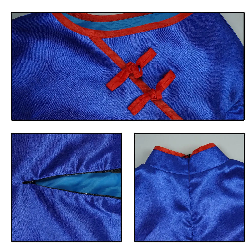A peça tem esse charme clássico de cheongsam misturado ao estilo marcante dos animes antigos: saia longa de corte firme, top elegante, braceletes vibrantes e calças contrastantes. No conjunto, vira uma presença. Você veste e pronto: parece saída direto do universo do Dragon Cos Ball.