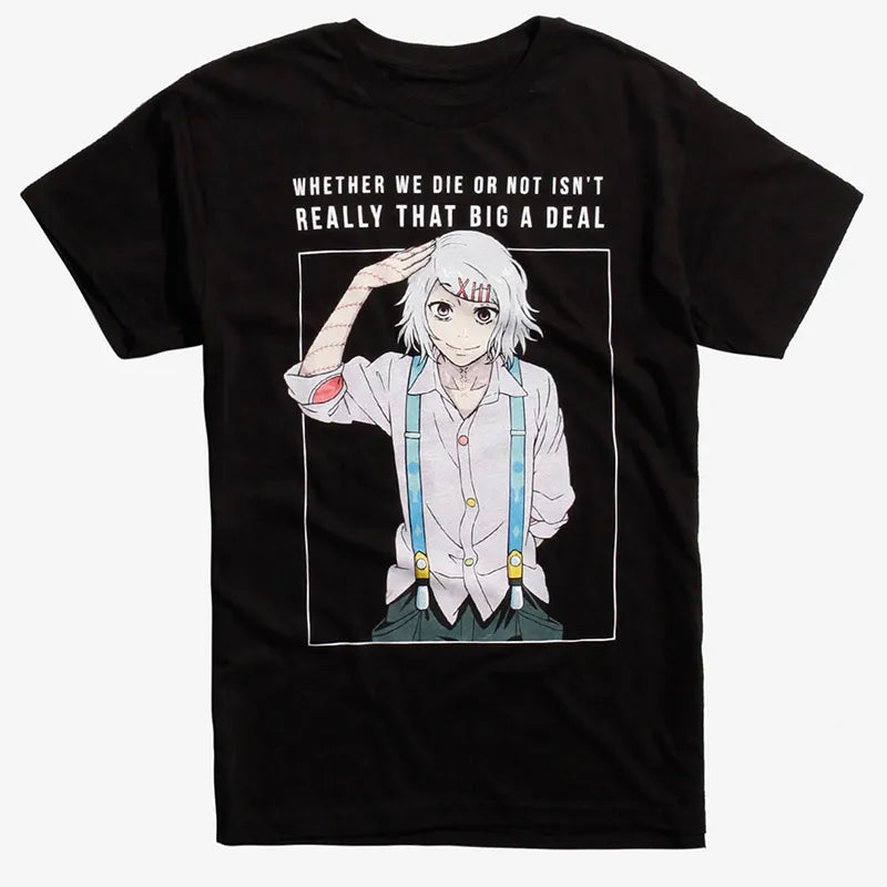 - Design Impactante: Apresenta uma estampa única com a frase "Wheter we die or not isnt that big deal", capturando a essência filosófica e a atitude desafiadora de Juuzou Suzuya.